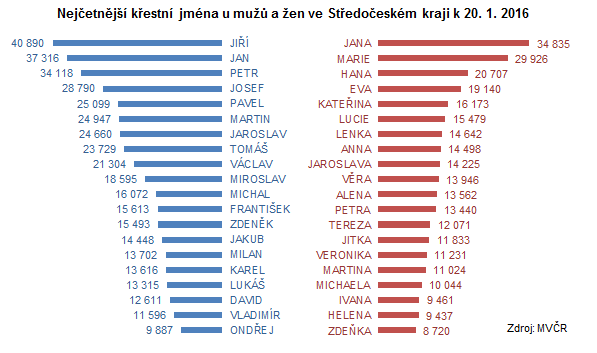 Podle informativních přehledů Ministerstva vnitra (MVČR) bylo k 20. 1. 2016 ve Středočeském kraji nejčetnějším křestním jménem u mužů Jiří (40,9 tis. osob), za ním následovala jména Jan (37,3 tis.) a Petr (34,1 tis.). Nejčetnějším ženským jménem v kraji byla Jana (34,8 tis.), druhá Marie (29,9 tis.) a třetí Hana (20,7 tis.). V celé republice bylo pořadí prvních tří nejčetnějších jmen u mužů stejné, u žen byla první Marie, druhá Jana a třetí Eva.