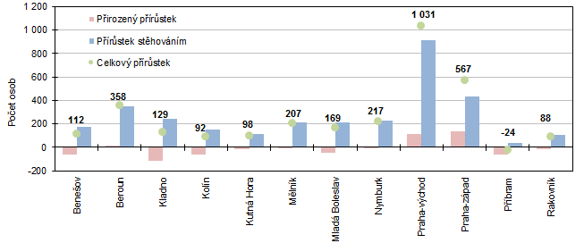 Jedná se o okresy v zázemí Prahy, které dlouhodobě zaznamenávají vysoké přírůstky stěhováním. Počet přistěhovalých osob byl výrazně nejvyšší ve srovnání s ostatními okresy (2 019, resp. 1 566 osob). Příznivá věková struktura přistěhovalých osob zde pozitivně ovlivňuje přirozenou měnu obyvatelstva v podobě kladných hodnot přirozeného přírůstku, nejvyšších nejen v rámci kraje, ale i celé republiky. Hodnota počtu narozených na tisíc obyvatel byla v okresech Praha-západ a Praha-východ v rámci kraje první a třetí nejvyšší a počet zemřelých na tisíc obyvatel byl nejnižší nejen v rámci kraje, ale i mezi všemi okresy celé České republiky.