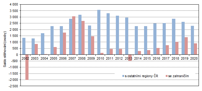 Graf 2: Saldo stěhování s ostatními regiony ČR a se zahraničím ve Středočeském kraji v 1. čtvrtletí 2002 až 2020