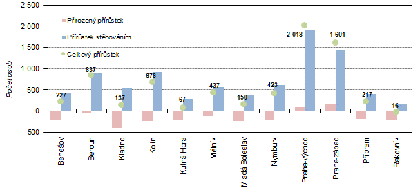 Na nárůstu počtu obyvatel Středočeského kraje se v prvních šesti měsících roku 2021 podílely především okresy Praha-východ a Praha-západ (nárůst o 2 018, resp. o 1 601 osob). Jejich podíl na celkovém přírůstku obyvatelstva kraje dosáhl v prvních šesti měsících roku 2021 podílu 53,4 %, ve stejném období předchozího roku to bylo 52,2 %.