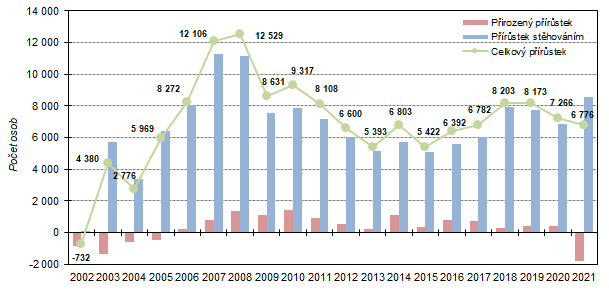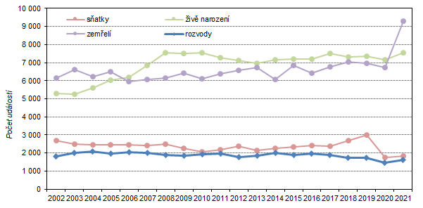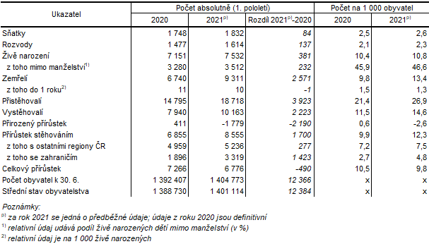 Zdroj dat: Demografická statistika – výsledky zpracování statistických hlášení řady Obyv; rozvody – Informační systém Ministerstva spravedlnosti ČR; stěhování – Informační systém evidence obyvatel (Ministerstvo vnitra ČR); Cizinecký informační systém (Ředitelství služby cizinecké policie).