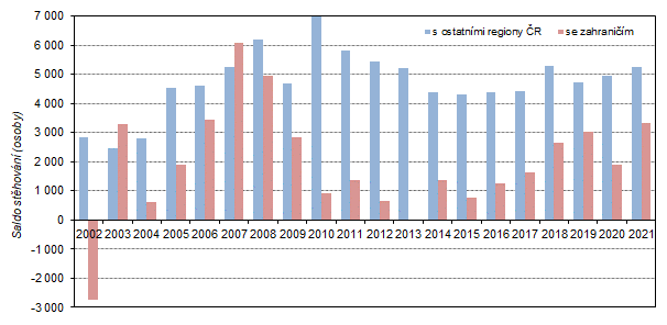 Graf 2: Saldo stěhování s ostatními regiony ČR a se zahraničím ve Středočeském kraji v 1. pololetí 2002 až 2021