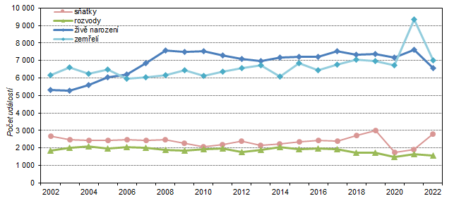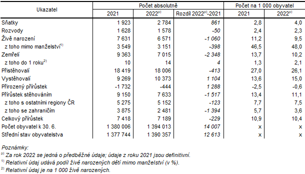 Veškeré údaje za rok 2022 jsou předběžné. Navazují na výsledky sčítání obyvatel, domů a bytů k 26.3.2021.