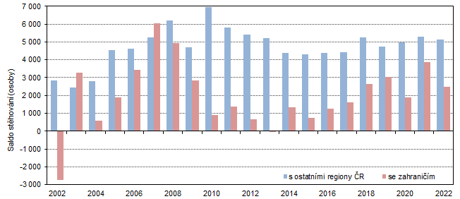 Celkový populační přírůstek Středočeského kraje zajistilo v 1. pololetí roku 2022 pouze stěhování, v důsledku něhož přibylo v kraji 7 633 obyvatel, což však bylo meziročně o 1 517 méně, tj. o 16,6 %. Dvoutřetinový podíl (67,5 %, 5 152 osob) na přírůstku stěhováním měl migrační přírůstek s ostatními regiony České republiky, u něhož došlo k meziročnímu poklesu o 2,3 %. Citelnější pokles, o 36,0 % (resp. o 1 394 osob), zaznamenal přírůstek stěhování se zahraničím, odkud získal Středočeský kraj 2 481 osob. V prvním pololetí roku 2022 se do Středočeského kraje přistěhovalo celkem 18 006 osob, což bylo o 2,2 % méně než ve stejném období loňského roku. U vystěhovalých (10 373 obyvatel) došlo naopak k nárůstu, meziročně jich bylo o 11,9 % více.