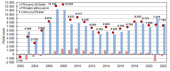 Celkový přírůstek počtu obyvatel se meziročně snížil o 3,1 %. Za nárůstem počtu obyvatel stál pouze přírůstek stěhováním (7 633 osob), přirozenou měnou ubylo 444 obyvatel. Meziročně se o čtvrtinu (o 25,1 %) snížil počet zemřelých osob, o 13,9 % méně bylo i živě narozených dětí. Citelně se zvýšil počet sňatků (o 44,8 %); druhý nejvyšší počet od roku 1998. O 16,6 % poklesl přírůstek stěhováním; na tomto snížení se více podílelo saldo stěhování ze zahraničí (meziročně bylo o 36,0 % nižší) než stěhování z ostatních krajů České republiky (meziročně o 2,3 % méně).