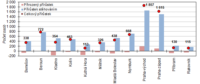 Na nárůstu počtu obyvatel Středočeského kraje se v prvních šesti měsících roku 2022 podílely především okresy Praha-východ a Praha-západ (nárůst o 1 857, resp. o 1 615 osob). Jejich podíl na celkovém přírůstku obyvatelstva Středočeského kraje činil v prvních šesti měsících letošního roku 48,3 % (za stejné období roku 2021 to bylo 51,9 %). Okresy Praha-východ a Praha-západ zaznamenaly během 1. pololetí 2022 společně s hl. m. Prahou a okresy Brno-venkov a Žďár nad Sázavou jako jediné přirozený přírůstek (v okrese Praha-východ se narodilo o 201 dětí více, než kolik zemřelo osob, v okrese Praha-západ to bylo o 104 více). Kromě toho okresy Praha-západ a Praha-východ během prvních šesti měsíců letošního roku zaznamenaly následkem relativně příznivé věkové struktury obyvatelstva v přepočtu na tisíc obyvatel nejnižší hodnoty počtu zemřelých osob mezi všemi okresy ČR, kromě toho vykázaly i nejvyšší přírůstky stěhováním u nás.