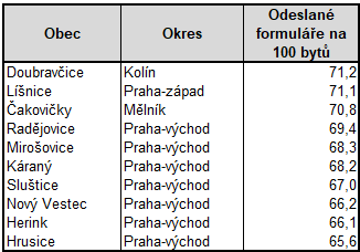 Z údajů o počtu odeslaných elektronických sčítacích formulářů na 100 bytů za každou obec si lze udělat obrázek, jak to v kraji vypadá z hlediska zapojení jednotlivých obcí do sčítání. Mezi nejaktivnější obce v rámci Středočeského kraje patří Doubravčice, Líšnice a Čakovičky. Na opačné straně žebříčku pak jsou Čejkovice, Bludov a Děkanovice.