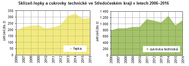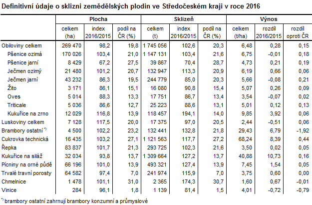 Obdobně jako v celé republice zaznamenali zemědělci ve Středočeském kraji v roce 2016 meziroční nárůst ve sklizeném objemu obilovin celkem, řepky, cukrovky, brambor, pícnin a chmele. K poklesu produkce došlo u luskovin a vinné révy.
