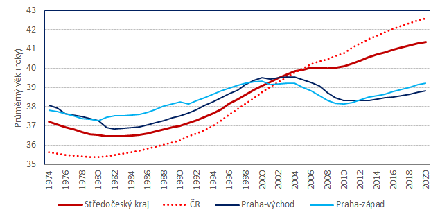 Změny v postavení středočeských okresů v důsledku suburbanizačních procesů a přistěhovalectví mladších osob do okolí Prahy reflektuje skutečnost, že zatímco v roce 1991 byl okres Praha-západ po hl. m. Praze okresem, v němž žilo obyvatelstvo s nejvyšším průměrným věkem, v roce 2020 byl tento okres věkově druhým nejmladším u nás. Zatímco v roce 1991 se věkově nejmladší středočeský okres Příbram umístil v rámci všech okresů ČR až na 27. místě, v roce 2020 se v první desítce okresů s nejnižším průměrným věkem umístilo sedm z celkových dvanácti okresů Středočeského kraje.