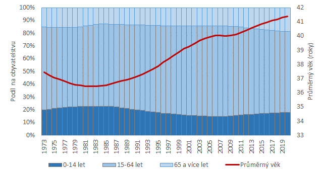 Graf 1: Obyvatelstvo Středočeského kraje podle hlavních věkových skupin a průměrný věk v letech 1973 až 2020