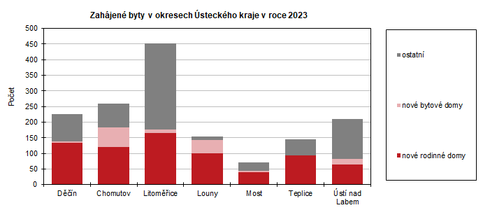 Výstavba bytů zahájená v loňském roce v Ústeckém kraji byla ze 47,1 % prováděna v nových rodinných domech, jednalo se o 715 bytů, proti předchozímu roku jejich počet poklesl o 454, tj. o 38,8 %. Z celkového počtu zahájené výstavby bytů v rodinných domech v kraji bude 22,9 % uskutečněno v okrese Litoměřice, v ostatních okresech se podíl pohyboval mezi 5,6 % v okrese Most až 18,7 % v okrese Děčín. V uplynulém roce byla v kraji zahájena výstavba 149 nových bytů v bytových domech, to znamenalo o 105 bytů (o 41,3 %) méně proti skutečnosti roku 2022. Na celkovém počtu zahájených bytů v bytových domech v kraji se ze 43,0 % podílel okres Chomutov, z 28,9 % okres Louny, z 12,8 % okres Ústí nad Labem, v ostatních okresech se podíl pohyboval od 3,4 % shodně v okresech Děčín a Most po 8,7 % v okrese Litoměřice. Žádná výstavba bytů v novém bytovém domě nebyla započata v okrese Teplice. V nebytových budovách bude v kraji postaveno 79 bytů (5,2 % ze zahájené výstavby), což představuje 74,5 % skutečnosti roku 2022. Nejvyšší podíl těchto bytů bude realizován v okrese Děčín (30,4 %), druhý nejvyšší podíl bude v okrese Chomutov (22,8 %), třetí v pořadí je okres Litoměřice (15,2 %), následují se shodným podílem 11,4 % okresy Teplice a Ústí nad Labem, 6,3 procentní podíl na počtu bytů v nebytových domech v kraji bude představovat výstavba v okrese Most, v okrese Louny se bude jednat o 2,5% podíl.