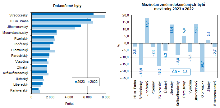 V roce 2023 bylo v kraji zkolaudováno celkem 1 272 nových bytů (3,3 procentní podíl na republikovém úhrnu 38 082 bytů). Oproti předchozímu roku bylo vloni dokončeno o 5,2 % (o 70 bytů) méně. Meziročně méně bytů bylo realizováno ve většině krajů s výjimkou 5 krajů – Jihočeského, Libereckého, Pardubického, Jihomoravského a Zlínského kraje, kde počet zkolaudovaných bytů převýšil skutečnost roku 2022. Pokles v Ústeckém kraji byl mezi kraji čtvrtý nejnižší, nejvyšší meziroční propad zaznamenali v Olomouckém kraji.