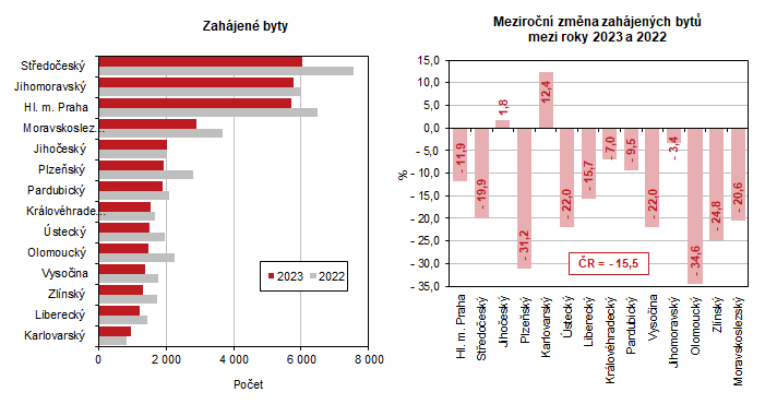 V průběhu roku 2023 byla v Ústeckém kraji zahájena výstavba celkem 1 518 bytů, v porovnání s rokem 2022 se jednalo o pokles 429 bytů, tj. o 22,0 %. V České republice bylo zahájeno celkem 35 700 bytů, tj. o 15,5 % méně než v roce 2022. Kraj se na republikovém počtu bytů podílel 4,3 % a byl šestý nejnižší. K meziročnímu poklesu došlo kromě Jihočeského a Karlovarského kraje ve všech ostatních krajích. Největší pokles vykázaly v Olomouckém kraji, kde počet zahájených bytů poklesl o více než třetinu, následoval Plzeňský a Zlínský kraj a dále Ústecký kraj a Kraj Vysočina.
