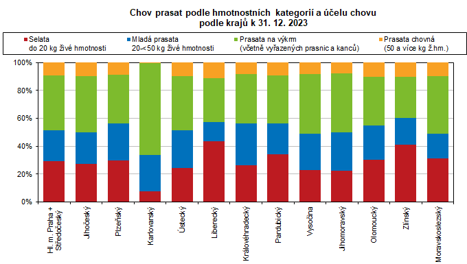 Z hlediska hmotnostních kategorií a účelu chovu prasat poklesly v loňském roce v Ústeckém kraji stavy selat s hmotností nižší než 20 kg téměř o polovinu (o 49,7 %). Naopak stavy mladých prasat od 20 do méně než 50 kg živé hmotnosti 2,6krát vzrostly, stavy chovných prasat se meziročně zvýšily o 1,2 % (snížení stavů u kanců a prasnic, nárůst u prasniček). Počty prasat na výkrm celkem (včetně vyřazených prasnic a kanců) o 15,0 % vzrostly, z toho u váhové kategorie 50 až méně než 80 kg ž.hm. o 21,2 % a v kategorii 80 až méně než 110 kg ž.hm. o 40,9 %. K jedinému poklesu došlo u nejvyšší váhové skupiny 110 a více kg živé hmotnosti, a to o 69,6 %.