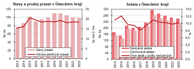 Ústečtí zemědělci chovali v roce 2023 celkem 23 930 selat do 20 kg, na celkových stavech prasat v kraji se selata podílela 24,2 %. V porovnání s ostatními kraji byl podíl v našem kraji čtvrtý nejnižší. Republikový průměr (27,7 %) byl o 3,5 p. b. vyšší než v kraji. Na celorepublikovém počtu selat se kraj podílel 6,4 % a byl šestý nejvyšší. Stavy mladých prasat vzrostly o 16 580 kusů, celkem bylo v kraji chováno 26 880 prasat této kategorie. Podíl mladých prasat od 20 do méně než 50 kg představoval 27,2 % celkových stavů prasat v kraji, podíl byl mezi kraji třetí nejvyšší. Na republikových stavech se Ústecký kraj podílel 8,1 % a byl pátý nejvyšší. Počet chovných prasat (50 a více kg živé hmotnosti) dosáhl 9 806 kusů, meziročně jejich stavy o 116 kusů vzrostly. Chovná prasata se na celkových stavech prasat v kraji podílela 9,9 % a jejich podíl byl pátý nejvyšší v porovnání s ostatními kraji. Na republikových stavech chovných prasat se kraj podílel rovněž 8,1 % a řadil se na čtvrtou nejvyšší příčku. V této kategorii byly v roce 2023 zastoupeny z 56,6 % prasnice (z nich bylo 66,6 % zapuštěných), ze 43,0 % prasničky (z nich 39,3 % zapuštěných), zbývajících 0,4 % tvořili kanci. Kategorie prasat na výkrm (včetně vyřazených prasnic a kanců) zaujímala ke konci roku 2023 v kraji 38,6 %, tento podíl byl v regionálním srovnání sedmý nejvyšší. Na celkových stavech prasat určených na výkrm v ČR se kraj podílel 7,2 %, což představovalo pátou nejvyšší hodnotu mezi kraji.