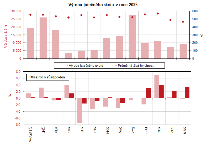 V Ústeckém kraji bylo v roce 2023 vyrobeno celkem 4 638 tun jatečného skotu v živé hmotnosti, proti skutečnosti předchozího roku to znamenalo pokles o 370 tun, tj. o 7,4 %. Na republikové produkci skotu se kraj podílel 2,7 %, tento podíl byl po Karlovarském kraji druhý nejnižší mezi kraji. Nejvíce se na produkci ČR podíleli zemědělci v Kraji Vysočina a v Jihočeském kraji, kde vyprodukovali 16,4 resp. 15,3 % celorepublikového objemu jatečného skotu. Průměrná živá hmotnost jednoho kusu jatečného skotu dosahovala v Ústeckém kraji 552,8 kg, (meziročně poklesla o 8,9 kg, tj. o 1,6 %). V porovnání s ostatními kraji zaujímala pátou nejvyšší pozici. Skot s nejvyšší průměrnou hmotností produkovali v Olomouckém kraji (571,4 kg), naproti tomu skot s nejnižší průměrnou hmotností chovali v Moravskoslezském kraji (467,1 kg).