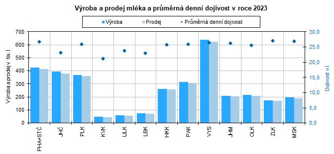 Výroba mléka v Ústeckém kraji dosáhla v loňském roce 59 041 tisíc litrů a byla proti roku 2022 vyšší o 3 836 tis. litrů (o 6,9 %). K nárůstu výroby mléka došlo ve všech krajích, z toho nejvyšší byl v Karlovarském kraji (o 8,7 %), druhé bylo navýšení v Ústeckém kraji. Na celorepublikové výrobě mléka se Ústecký kraj podílel 1,7 %, což byl druhý nejnižší podíl po Karlovarském kraji. Naproti tomu nejvyšší podíl (18,9 %) zaujímal Kraj Vysočina. Z vyprodukovaného množství mléka bylo v roce 2023 v kraji prodáno 57 045 tis. litrů (meziroční nárůst o 3 738 tis. litrů, o 7,0 %), tržnost mléka v kraji tak dosáhla 96,6 % a byla zhruba na úrovni předchozího roku. Z vyrobeného mléka bylo v republice prodáno v průměru 97,2 %, tj. o 0,6 p. b. více než v Ústeckém kraji. Tržnost mléka v kraji byla čtvrtá nejnižší po Jihočeském, Karlovarském a Libereckém kraji. Naproti tomu nejvyšší podíl vyrobeného mléka prodali v Jihomoravském kraji (97,9 %). Tržnost nad 97 % vykázali ještě v dalších 7 krajích.