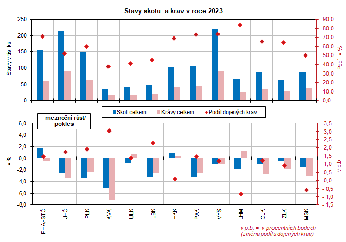 Chovy krav se na celkových stavech skotu v Ústeckém kraji podílely 41,3 %, tento podíl byl v mezikrajovém srovnání šestý nejnižší. Nejvyšší podíl krav měly chovy v Moravskoslezském kraji (45,4 %) a dále v Karlovarském a ve Zlínském kraji (44,8 resp. 43,6 %). V roce 2023 bylo v Ústeckém kraji chováno 16 468 krav, jejich stavy meziročně vzrostly, a to o 117 kusů, tj. o 0,7 %. K nárůstu došlo kromě Ústeckého kraje ještě v Královéhradeckém a Jihomoravském kraji. Navýšení stavů v Ústeckém kraji bylo relativně druhé nejvyšší po Jihomoravském kraji. Podíl dojených krav ve prospěch ostatních krav se dlouhodobě snižoval ve většině krajů. V roce 2023 však došlo kromě Jihomoravského a Moravskoslezského kraje k meziročnímu nárůstu podílu dojených krav. V Ústeckém kraji představoval vloni tento podíl 41,0 % a proti předchozímu roku vzrostl o 1,4 p. b. Podíl dojených krav v Ústeckém kraji je od roku 2009 v mezikrajovém srovnání druhý nejnižší po Karlovarském kraji. Nejvyšší podíl dojených krav na celkovém počtu krav je dlouhodobě v Jihomoravském kraji (83,8 % v loňském roce), republikový úhrn dosahoval 62,9 %.