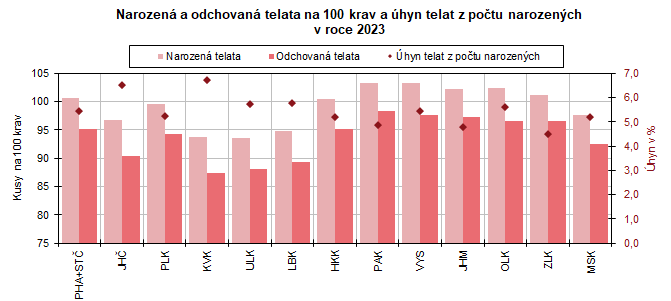 V roce 2023 se ústeckým chovatelům skotu narodilo 15 686 telat, v porovnání s předchozím rokem to bylo o 181 telat více, tj. o 1,2 %, jednalo se o druhé nejnižší počty po Karlovarském kraji. Na celorepublikovém úhrnu narozených telat se kraj podílel 2,7 %, tento podíl byl rovněž druhý nejnižší mezi kraji. V přepočtu na 100 krav se v kraji narodilo 93,5 telat, to je o 1,2 telat (o 1,3 %) více než v předchozím roce. Do 3 měsíců od narození uhynulo 899 kusů, proti roku 2022 to bylo o 71 telat (o 7,3 %) méně. Procento uhynulých telat z počtu narozených v kraji v roce 2023 pokleslo a dosáhlo 5,7 % proti 6,3 % v předchozím roce. V mezikrajovém porovnání se hodnota tohoto ukazatele pohybovala od 4,5 % ve Zlínském kraji po 6,7 % v Karlovarském kraji. Ústecká hodnota zaujímala mezi kraji čtvrtou nejhorší pozici. Počet odchovaných telat na 100 krav v Ústeckém kraji byl v roce 2023 vyšší než v roce 2022, celkem bylo v kraji odchováno 88,2 telat na 100 krav proti 86,6 v roce předchozím. Hodnotou loňského roku zaujímal kraj druhou nejnižší příčku po Karlovarském kraji. Nejvyšší počet telat na 100 krav odchovali v Pardubickém kraji (98,2 kusů). Republikový průměr odchovu telat na 100 krav představoval 94,4 telat a byl tak o 6,2 p. b. vyšší než v Ústeckém kraji.