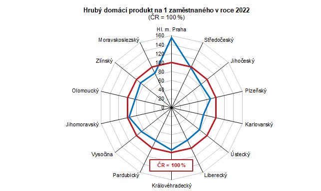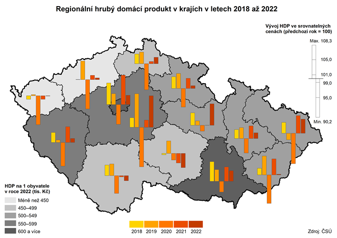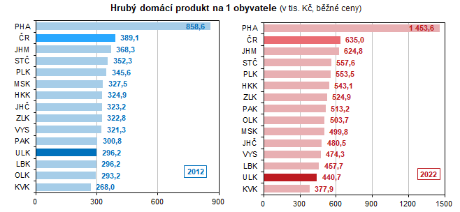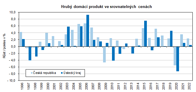 Hrubý domácí produkt ve srovnatelných cenách (tzn. po očištění od inflace) v roce 2022 meziročně vzrostl ve většině krajů republiky s výjimkou 3 krajů – nejvyšší pokles evidovali v Kraji Vysočina (o 3,5 %), následovaném Jihočeským a Karlovarským krajem (pokles o 1,2 resp. 0,1 %). Nejrychleji se, u 11 krajů s meziročním růstem, ekonomika reálně vyvíjela ve Středočeském kraji (nárůst o 7,8 %), zvýšení v Ústeckém kraji o 0,4 % bylo druhé nejnižší po Zlínském kraji. V porovnání s meziročním celorepublikovým růstem HDP (o 2,4 %) byl regionální výsledek nižší v sedmi krajích včetně Ústeckého.