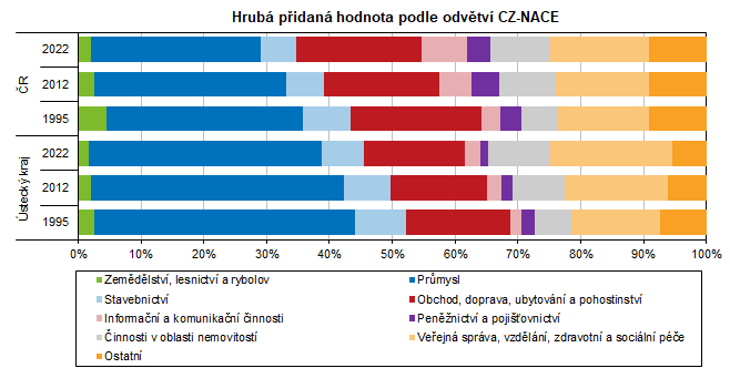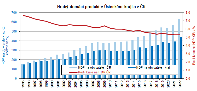 Regionální hrubý domácí produkt Ústeckého kraje dosáhl v roce 2022 v běžných cenách hodnoty 360 731 mil. Kč a byl nejvyšší od roku 1995. K nominálnímu růstu došlo ve všech krajích republiky, v Ústeckém kraji představoval 11,6 % a byl mezi kraji šestý nejvyšší. Úloha kraje v rámci republiky postupně klesala, v letech 2021 a 2022 se kraj na tvorbě HDP ČR podílel 5,3 %, proti 7,7 % v roce 1995. Podíl posledních dvou let byl nejnižší za posledních 28 let. V mezikrajovém srovnání je pořadí podílu Ústeckého kraje na ČR trvale páté nejvyšší.