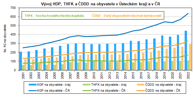 V zájmu srovnatelnosti vývoje v ČR a Ústeckého kraje jsou v následujícím grafu zobrazeny přepočtené údaje na 1 obyvatele (i s vědomím toho, že se na tvorbě HDP podílejí i cizinci a není zohledněna mezikrajská dojížďka za prací). Graf zahrnuje též vývoj tvorby hrubého fixního kapitálu, přestože s rozdělením HDP souvisí pouze zprostředkovaně.