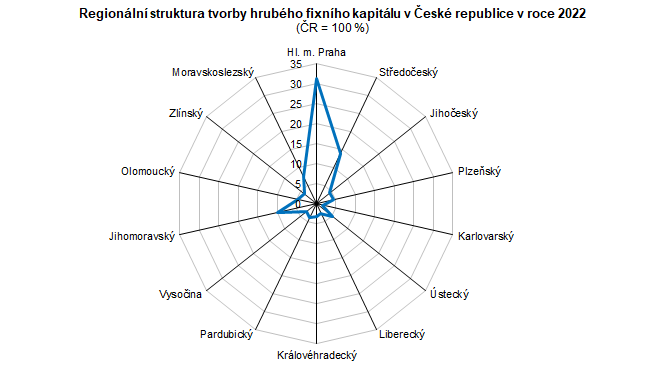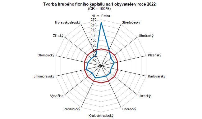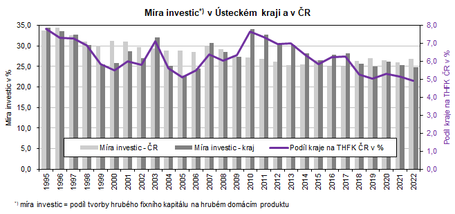 Vývoj investiční aktivity v regionálním členění (např. nové investice, rekonstrukce, modernizace, nákupy) představuje tvorba hrubého fixního kapitálu, která dosáhla nejvyšší hodnoty v posledním sledovaném roce, v roce 2022, a to jak absolutně, tak na 1 obyvatele kraje. V minulém roce se THFK na obyvatele Ústeckého kraje řadila na pátou nejnižší příčku mezi kraji. Nejlepší pozici za posledních 28 let obsadil Ústecký kraj v roce 2010, kdy THFK na obyvatele byla třetí nejvyšší mezi kraji. Ve všech letech byla hodnota regionálního THFK na obyvatele pod republikovým průměrem. V roce 1995 byla THFK na obyvatele v kraji nižší o 1,2 tisíc Kč proti průměru ČR, zatímco v roce 2022 připadalo na 1 obyvatele Ústeckého kraje o 60,5 tisíc Kč méně než na 1 obyvatele celé České republiky.