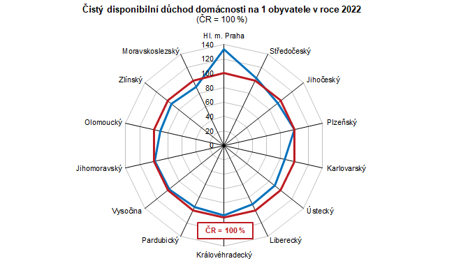 Nejvyšší čistý disponibilní důchod domácností, ukazatel, který je využíván pro hodnocení úrovně materiálního bohatství domácností trvale bydlících v daném regionu, připadl v Ústeckém kraji v absolutní výši na rok 2022, když celkový objem ČDDD dosáhl 239 625 mil. Kč. Nejvyšší od roku 1995 byl i objem ČDDD v přepočtu na 1 obyvatele, činil 292 771 Kč. Zatímco v roce 1995 byl relativní důchod na 1 obyvatele Ústeckého kraje pátý nejvyšší mezi kraji, od roku 2002 do roku 2010 obsazoval střídavě poslední nebo předposlední příčku a v letech 2011–2019 byl ČDDD na obyvatele mezi kraji nejnižší. Ke zlepšení došlo v roce 2020, kdy kraj obsadil čtvrtou nejnižší příčku, ale v roce 2021 byl ČDDD opět druhý nejnižší a v minulém roce se situace ještě zhoršila a Ústecký kraj obsadil nejnižší příčku. V porovnání s republikovým průměrem, kde ČDDD na obyvatele dosáhl v roce 2022 hodnoty 326,8 tis. Kč, byl relativní důchod obyvatele Ústeckého kraje o 34,0 tis. Kč nižší. Přitom v roce 1995 činil rozdíl mezi krajským a republikovým relativním důchodem na obyvatele pouhých 111 Kč.