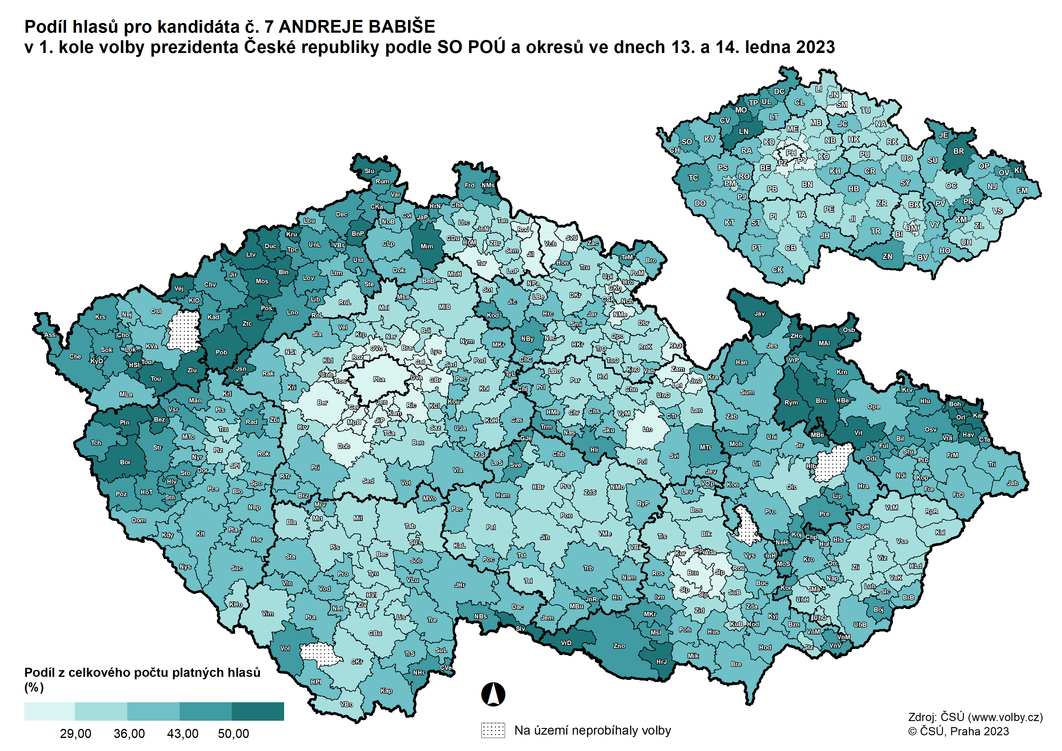 - Umístění kandidáta č. 7 Andreje Babišev 1. kole volby prezidenta ČR podle SO POÚ a okresů ve dnech 13. a 14. ledna 2023
