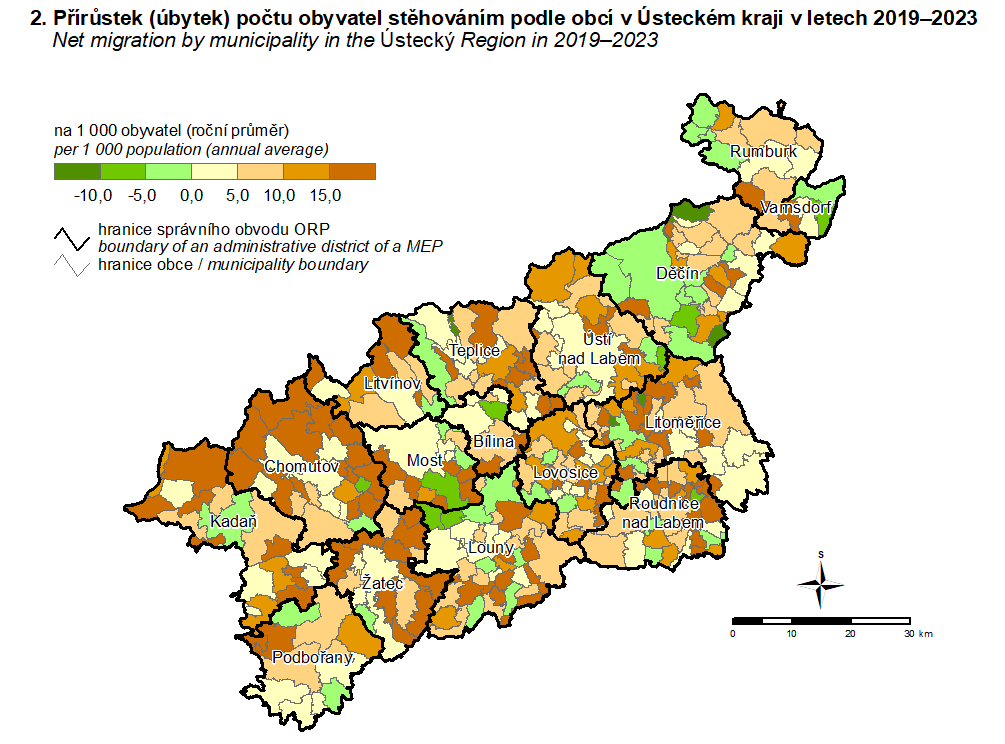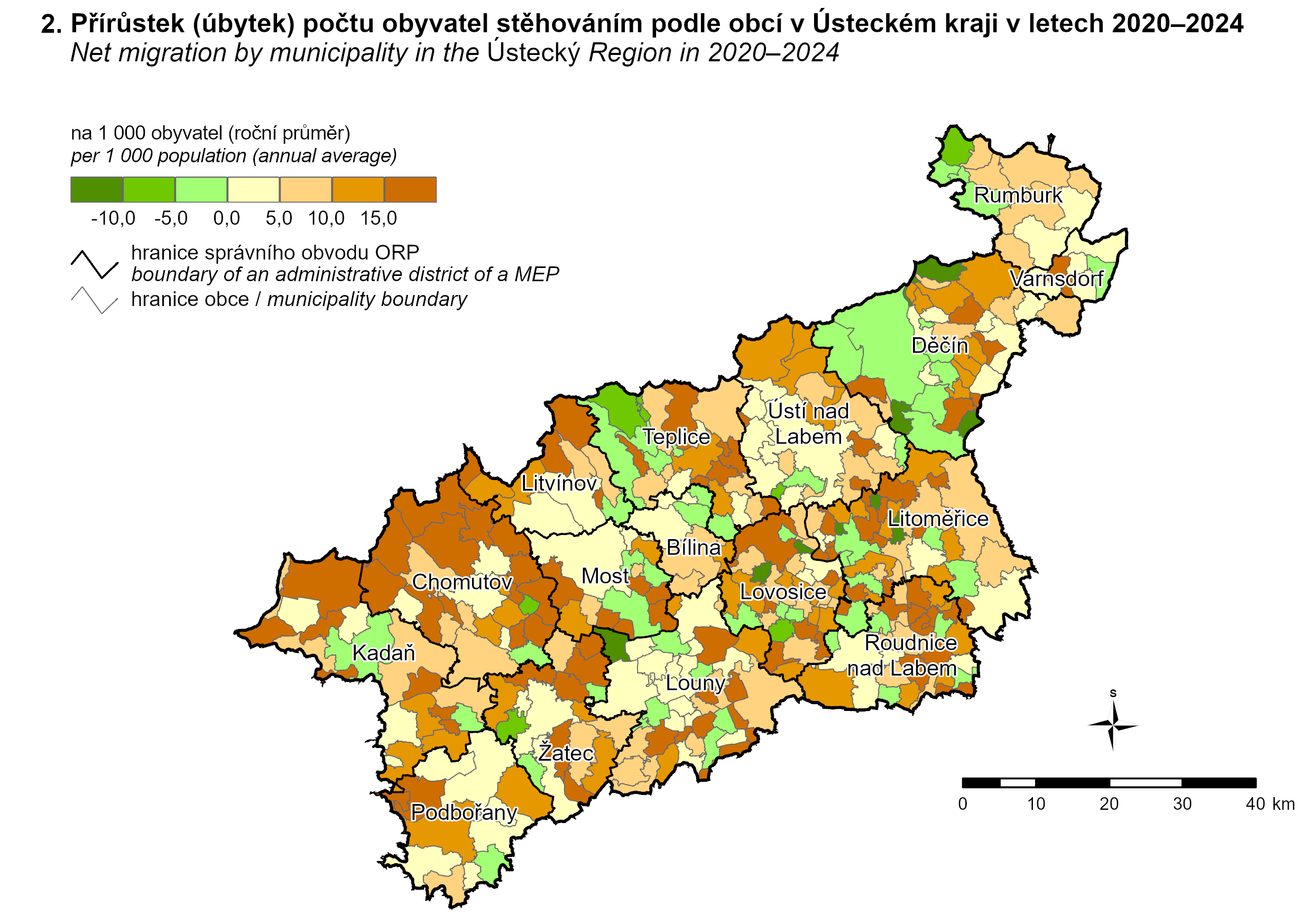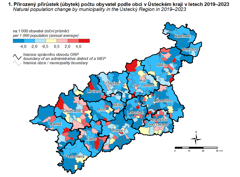 V Ústeckém kraji se nachází 354 obcí, z toho 59 má statut města. Největší počet obcí se nachází v okresech Litoměřice a Louny, kde téměř dvě pětiny obyvatel žijí v obcích do 2 tis. obyvatel a podíl obyvatel žijících v obcích nad 2 tisíce obyvatel je zde nejmenší mezi okresy. Největším městem je statutární město Ústí nad Labem, kde žije více jak 90 tis. obyvatel, což je více jak tři čtvrtiny obyvatel okresu.