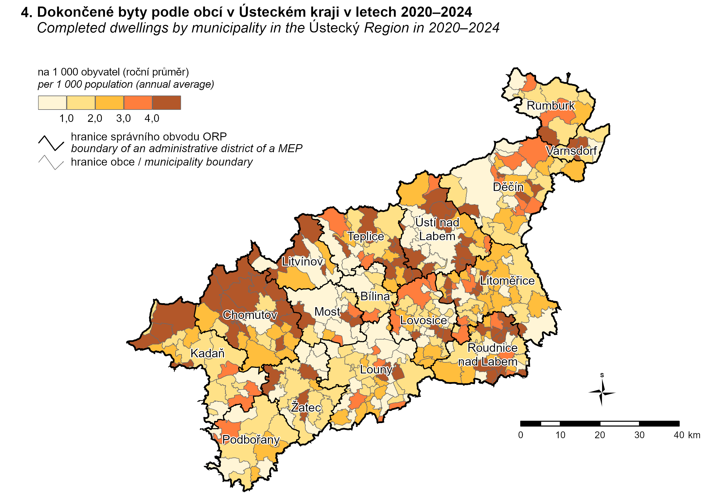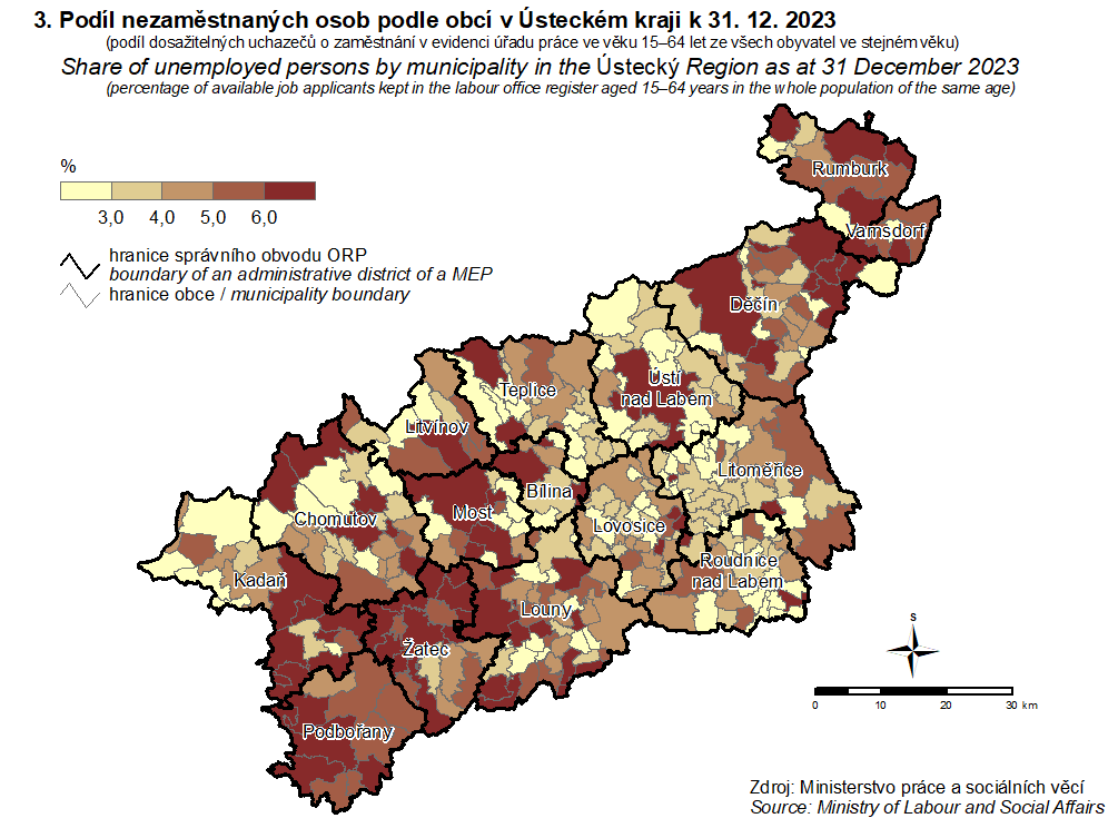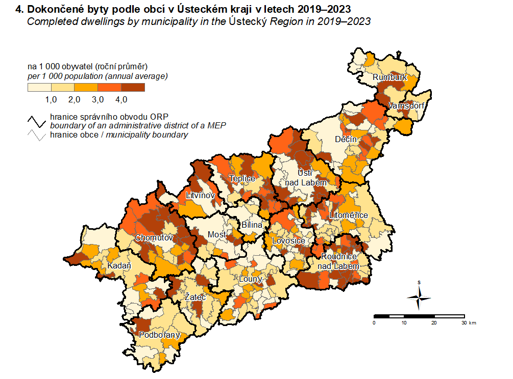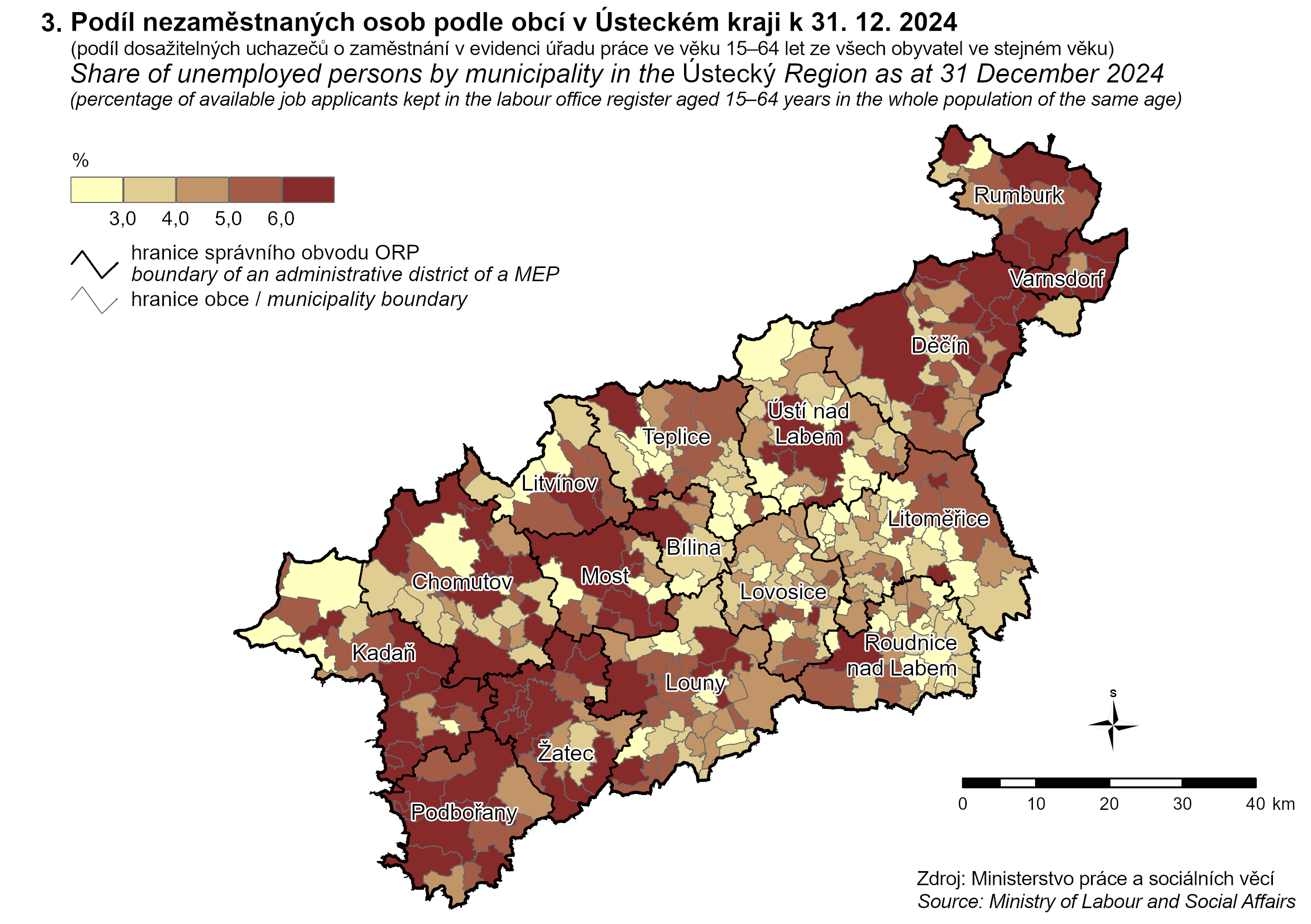 V Ústeckém kraji se nachází 354 obcí, z toho 59 má statut města. Největší počet obcí se nachází v okresech Litoměřice a Louny, kde téměř dvě pětiny obyvatel žijí v obcích do 2 tis. obyvatel a podíl obyvatel žijících v obcích nad 2 tisíce obyvatel je zde nejmenší mezi okresy. Největším městem je statutární město Ústí nad Labem, kde žije více jak 90 tis. obyvatel, což je více jak tři čtvrtiny obyvatel okresu.
