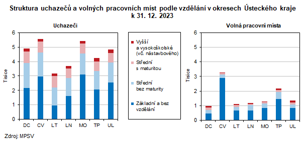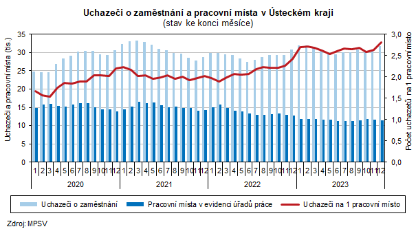 K 31. prosinci 2023 registrovaly úřady práce na území Ústeckého kraje celkem 31 846 neumístěných uchazečů o zaměstnání, přičemž dosažitelných uchazečů ve věku 15–64 let, kteří mohli bezprostředně nastoupit do zaměstnání při nabídce vhodného pracovního místa, bylo 29 304 (92 % evidovaných uchazečů). Na úřadech práce bylo v kraji v prosinci nově zaregistrováno celkem 3 415 osob (proti listopadu se tento počet snížil o 409 osob), z jejich evidence naopak odešlo 2 190 uchazečů.