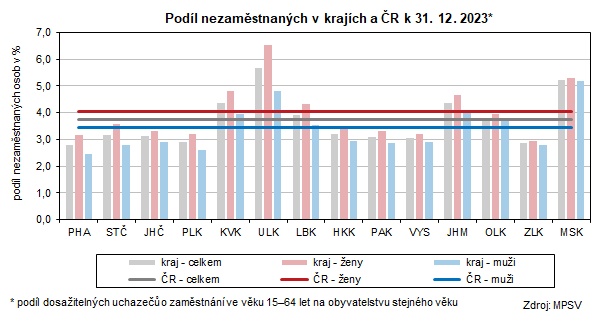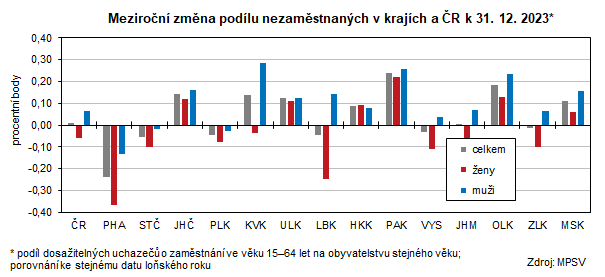 Meziměsíčně se nezaměstnanost zvýšila ve všech krajích ČR. Nejvyšší nárůst jsme zaznamenali v Jihočeském kraji a v Kraji Vysočina (o 0,42 resp. o 0,41 p. b.), nejméně se nezaměstnanost po Praze zvýšila ve Středočeském (o 0,15 p. b.) a v Karlovarském kraji (o 0,19 p. b.). Celorepublikově byla nezaměstnanost ke konci prosince vyšší o 0,24 p. b., než tomu bylo na konci listopadu, a dosáhla podílu 3,73 %. Nejnižších hodnot podílu nezaměstnaných osob bylo dosaženo v hlavním městě a ve Zlínském kraji (2,80 resp. 2,88 %), ve Zlínském kraji byla rovněž zjištěna i nejnižší nezaměstnanost žen (2,95 %) z celé ČR. Pod tříprocentní nezaměstnaností se pohyboval ještě i Plzeňský kraj. Nejnižší nezaměstnanost mužů byla zjištěna v Praze, a to 2,44 %. Nejvyšší celkové nezaměstnanosti bylo dosaženo v našem kraji (5,66 %), kde byla rovněž nejvyšší nezaměstnanost žen (6,54 %). Nejvyšší nezaměstnanost mužů byla v prosinci v Moravskoslezském kraji (5,17 %).