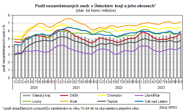 Nezaměstnanost v Ústeckém kraji v prosinci 2023 meziměsíčně vzrostla na hodnotu 5,66 %. Meziměsíčně se zvýšila nezaměstnanost mužů i žen v kraji. V jednotlivých okresech kraje se nezaměstnanost vyvíjela různě, nejvíce vzrostla nezaměstnanost v okrese Děčín a Louny.