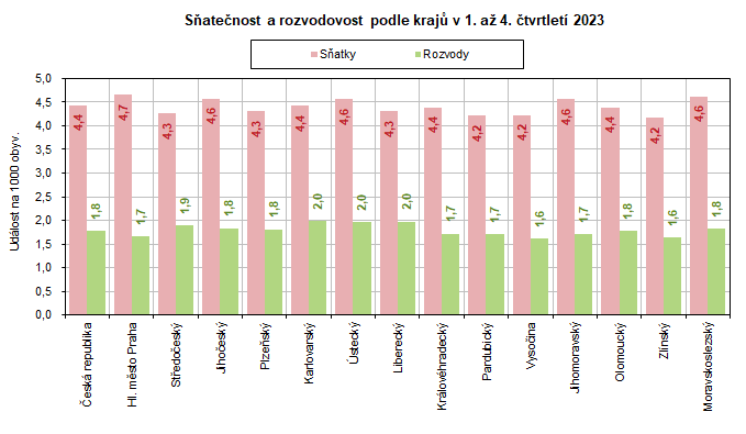 Od počátku roku 2023 uzavřelo v Ústeckém kraji manželství 3 703 párů snoubenců, tj. o 578 (o 13,5 %) méně než za rok 2022. Počet sňatků na tisíc obyvatel dosáhl hodnoty 4,6 ‰. Meziročně sňatečnost v kraji poklesla o 0,7 bodů promile. V mezikrajovém srovnání byla pátá nejvyšší.