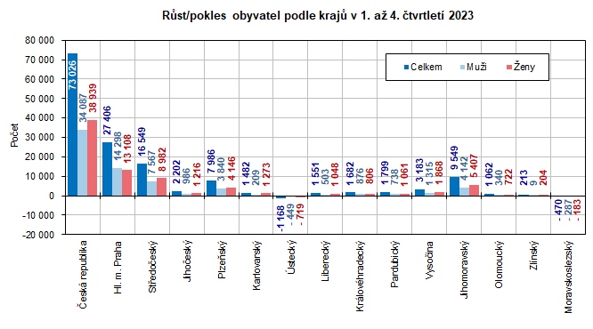 Podle předběžných výsledků žilo ke konci roku 2023 v Ústeckém kraji 811 169 obyvatel, v tom 399 430 mužů a 411 739 žen. Za uplynulých 12 měsíců loňského roku tak počet obyvatel kraje poklesl celkem o 1 168 osob, a to vlivem poklesu počtu mužů o 449 a žen o 719.