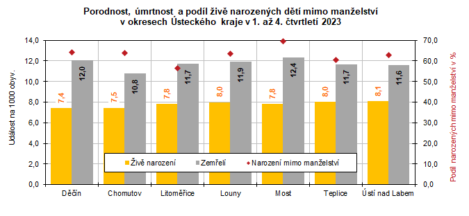 Mezi okresy Ústeckého kraje byla v loňském roce dosažena nejvyšší porodnost v okrese Ústí nad Labem, kde byla zároveň druhá nejnižší úmrtnost po okrese Chomutov. Nejnižší porodnost evidovali v okrese Děčín. Nejvyšší počet zemřelých na tisíc obyvatel zaznamenali v okrese Most, od roku 1998 je zde evidován nejvyšší podíl dětí narozených mimo manželství, který v loňském roce představoval 69,5 %. Naproti tomu nejnižší podíl dětí narozených svobodným matkám se trvale nachází v okrese Litoměřice, v roce 2023 dosáhl hodnoty 56,5 %.
