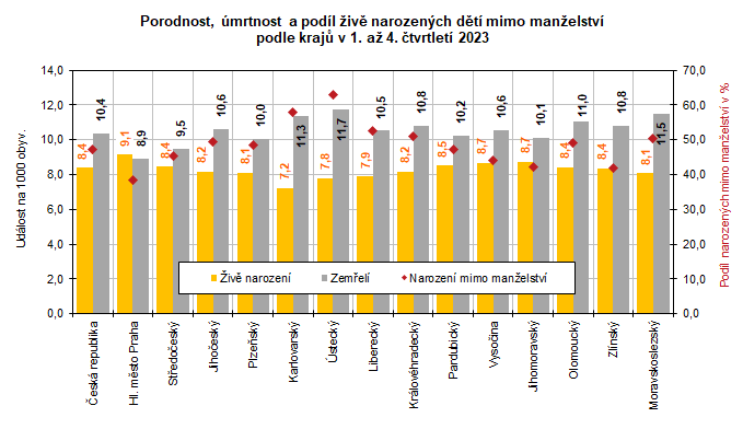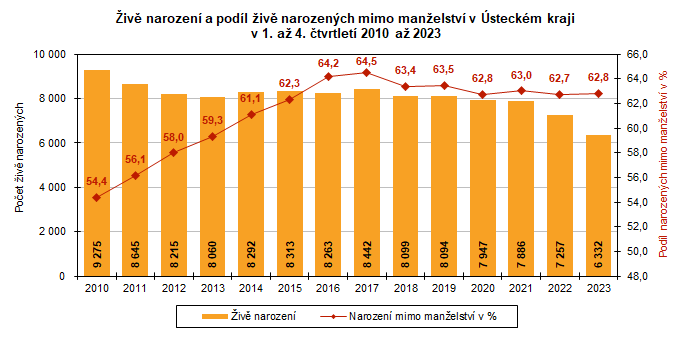Od ledna do prosince loňského roku se v Ústeckém kraji živě narodilo 6 332 dětí, což je o 925 novorozenců (o 12,7 %) méně než ve stejném období roku 2022 a nejméně od roku 2000. Meziročně vzrostl o 0,1 procentního bodu (p. b.) podíl živě narozených dětí mimo manželství na 62,8 %. Podíl mimomanželských dětí byl nejvyšší mezi kraji, v ČR představoval 47,1 %. Nejnižší podíl dětí narozených mimo manželství zaznamenali v Praze (38,5 %), jako druhý se umístil Zlínský kraj se 41,7, méně než 45 % narozených nemanželských dětí vykazoval ještě Jihomoravský kraj (42,2 %) a Kraj Vysočina (44,0 %). Podíl dětí narozených mimo manželství meziročně vzrostl celkem ve třech krajích, z nich byl nárůst v Ústeckém kraji nejnižší, nejvyšší růst vykazoval Liberecký kraj (+0,5 p. b.), následoval Olomoucký kraj (+0,3 p. b.). V ostatních krajích došlo k poklesu, z toho nejvyšší byl v hlavním městě Praze (-2,6 p. b.).