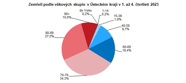 Nejvyšší zastoupení na celkovém počtu zemřelých v Ústeckém kraji měly v roce 2023 osoby ve věku 70–79 let, 80–89 a 60–69 let. Podíl ostatních věkových skupin na počtu zemřelých v kraji představoval jednotlivě 10 % a méně. Meziroční nárůst podílu zemřelých osob v jednotlivých věkových skupinách za 12 měsíců loňského roku zaznamenali v Ústeckém kraji osoby do 1 roku, dále ve věku 1–14, 70–79 a 80–89 let, u ostatních věkových kategorií jsme zaznamenali pokles. Porovnáním jednotlivých věkových skupin s republikovým průměrem registrujeme v kraji nižší zastoupení zemřelých osob 80letých a starších, zastoupení ostatních věkových skupin bylo na celkovém počtu zemřelých v Ústeckém kraji vyšší než v ČR.