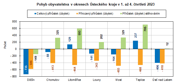 Během roku 2023 se počet obyvatel ve většině okresů Ústeckého kraje, kromě Litoměřického a Teplického okresu, snížil. V okrese Děčín se jednalo jak o úbytek obyvatel stěhováním, tak i o přirozený úbytek obyvatel. V ostatních okresech s poklesem byl příčinou výhradně přirozený úbytek obyvatel (zemřelo více osob, než se narodilo), výsledek migrace u nich byl kladný. V okresech Litoměřice a Teplice se jednalo rovněž přirozený úbytek obyvatel, ale migrace byla kladná.