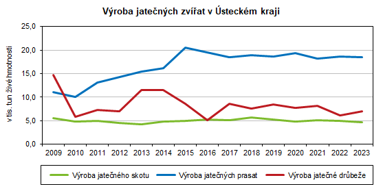 Výroba jatečných zvířat v kraji v tunách živé hmotnosti se vyvíjela různě. Výroba jatečného skotu nepodléhala meziročně stejně jako stavy skotu v kraji výraznějším změnám. Na celkovém objemu vyrobeného jatečného skotu v ČR se kraj v období 2005–2023 podílel nejčastěji okolo 3 %. Nárůst stavů prasat v kraji po roce 2010 pozitivně ovlivnil objem vyrobených jatečných prasat. To se projevilo, i s ohledem na nepříznivý vývoj chovu prasat v ČR, na růstu podílu, který kraj zaujímal v celkové produkci jatečných prasat v ČR. V období 2005–2008 se tento podíl pohyboval mezi 3,7 až 4,5 %, vlivem nepříznivé situace v chovu prasat v kraji následně poklesl na 2,9 % v roce 2010 a od roku 2011 převážně meziročně rostl. V roce 2023 se kraj na celkové produkci jatečných prasat ČR podílel ze 7,1 %, což bylo nejvíce od roku 2005.