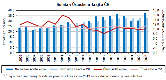 Počet narozených selat na 1 prasnici v kraji převážně rostl a ve většině let byl vyšší, než počet selat narozených na 1 prasnici v průměru v celé ČR. Výjimkou byly roky 2007–2009, 2014 a 2021–2022. V letech 2016, 2019 a 2023 se v kraji v průměru na 1 prasnici narodilo o 4 a více selat více, než tomu bylo v celé ČR. Podíl uhynulých selat byl vyšší především v první polovině sledovaného období. Do roku 2014 se, s výjimkou let 2008 a 2013, pohyboval nad 12,0 %. Od roku 2015 podíl uhynulých selat nepřekročil 11,0 %, nejméně jich uhynulo v roce 2017 (8,2 % narozených selat).