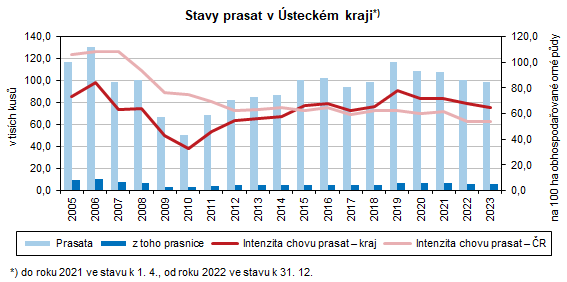 Výše uvedené skutečnosti ovlivnily vývoj ukazatele intenzity chovu prasat, tj. počet kusů prasat na 100 ha obhospodařované orné půdy. V letech 2005 až 2014 byla intenzita chovu prasat v ČR vyšší než v kraji. Největší rozdíl byl zjištěn v roce 2010, kdy bylo v kraji dosaženo pouze 44,1 % intenzity chovu prasat v ČR. Od roku 2015 byla intenzita chovu prasat v kraji v porovnání s ČR vyšší a tento rozdíl převážně rostl. V roce 2023 se na 100 ha obhospodařované orné půdy v kraji chovalo o 11,1 prasat více (o 20,5 %) než tomu bylo v průměru v ČR.