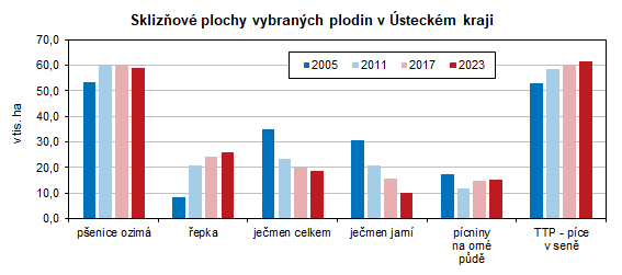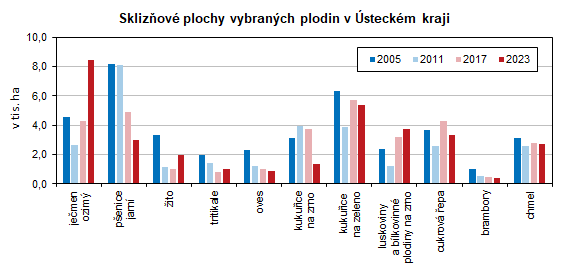 Sestupný trend jsme v případě výměry sklizňových ploch zaznamenali především u pšenice jarní i ječmenu jarního, dále u ovsa, žita, tritikale a brambor. V letech 2018–2020 a 2022–2023 také byly v kraji v porovnání s ostatními roky sledovaného období zjištěny mnohem nižší výměry sklizňových ploch kukuřice na zrno. Mírně se snižovaly i sklizňové plochy chmele.