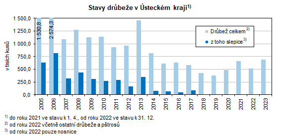Vývoj stavů drůbeže (od roku 2022 včetně ostatní drůbeže a pštrosů) a slepic (od roku 2022 pouze nosnic pro produkci konzumních vajec) nebyl v období 2005–2023 v kraji příznivý. Zatímco v letech 2005–2010 se v kraji chovalo více jak 1 mil. kusů drůbeže a v roce 2006 dokonce více jak 2,5 mil. kusů drůbeže, od roku 2015 to bylo méně než 700 tis. kusů. S tím, jak se snižovaly stavy drůbeže v kraji, se snižoval i podíl drůbeže chované v kraji na celkovém stavu drůbeže chované v ČR. Zatímco v roce 2005 činil tento podíl 6,0 % (v roce 2006 dokonce 10,0 %), v následujících letech převážně klesal. V letech 2015–2023 se kraj podílel na celkových stavech drůbeže v ČR v rozmezí 1,6 (rok 2019) až 3,2 % (rok 2023).