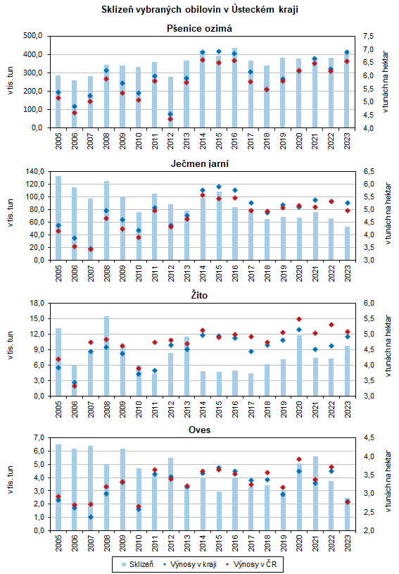 Obilninám včetně kukuřice na zrno se v Ústeckém kraji dařilo. V období 2005–2023 vykazovali pěstitelé v kraji vyšší výnosy na hektar, než tomu bylo v průměru v ČR. Výjimkou byl pouze oves a žito, u kterých byly výnosy v jednotlivých letech v kraji v porovnání s ČR převážně nižší. Vyšší výnosy v porovnání s ČR byly rovněž v kraji dosahovány u luskovin a bílkovinných plodin a kukuřice na zeleno. Naopak nižších výnosů bylo v kraji často dosahováno u vína, brambor a převážně v posledních letech také u pícnin na orné půdě. Výraznější rozdíly ve výnosech na hektar nebyly v porovnání s ČR v kraji zjištěny u řepky, chmele, technické cukrovky či píce v seně sklizené z trvalých travních porostů.