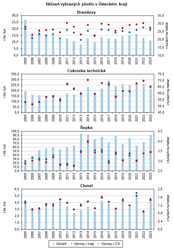 Stejně jako u obilovin měly hektarové výnosy ostatních sledovaných plodin rostoucí trend. Ten společně s nárůstem výměry sklizňových ploch přispěl z dlouhodobého pohledu k růstu celkové sklizně u luskovin a bílkovinných plodin, technické cukrovky, řepky a vína. V případě chmele byl nárůst výnosů na hektar schopný kompenzovat mírně se snižující výměry sklizňových ploch a tak i u chmele z dlouhodobého pohledu docházelo k mírnému nárůstu celkového objemu sklizně. V případě píce v seně z trvalých travních porostů přispěl k celkovému nárůstu sklizně především nárůst výměry sklizňových ploch, výnos píce na ha i přes výrazné meziroční výkyvy v druhé polovině sledovaného období 2005–2023 nevykazoval z dlouhodobého pohledu klesající či rostoucí trend. Celkový objem sklizně za sledované období převážně klesal u brambor a to v důsledku snižující se výměry sklizňových ploch.