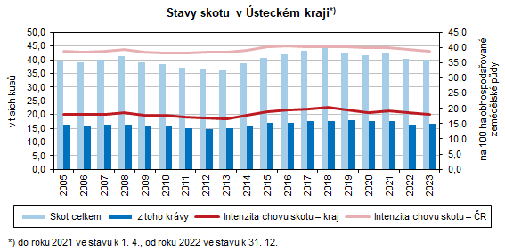 V období 2005–2023 se Ústecký kraj na celkových stavech skotu chovaného v ČR podílel jen málo. V kraji byly nejvyšší stavy skotu k 1. 4. 2018, kdy jejich počty dosáhly 44 339 kusů. Nejméně jich naopak bylo zjištěno k 1. 4. 2013 (36 246 kusů). Ve sledovaném období se podíl skotu chovaného v kraji na celkovém počtu skotu v ČR pohyboval mezi 2,7 až 3,1 %, u krav se toto rozmezí pohybovalo mezi 2,7 až 3,0 %. Na celkovém počtu skotu se krávy podílely z více jak 40 %. Nejméně tomu bylo v roce 2008, kdy jejich podíl dosáhl pouze 39,1 % celkového počtu skotu v kraji. Intenzita chovu skotu, tj. počet krav na 100 ha obhospodařované zemědělské půdy je v kraji výrazně nižší než v průměru celé ČR. V průběhu období 2005–2023 se pohybovala mezi 42,9 až 50,4 % úrovně ČR.
