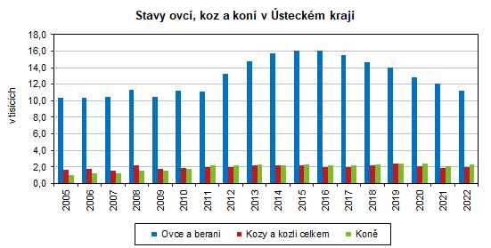Stavy ovcí a beranů v kraji do roku 2011 rostly jen mírně. V následujících letech docházelo k výraznějším nárůstům až do období 2015–2016, kdy stavy ovcí přesáhly 16 tis. kusů. Od roku 2017 docházelo k pravidelným poklesům až na stav 11 165 kusů v roce 2022, čímž se hodnoty přiblížily stavům před rokem 2012. Podíl kraje na celkových stavech ovcí a beranů se ve sledovaném období pohyboval v intervalu od 5,3 (rok 2011) do 7,4 % (rok 2005).