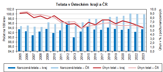 Počet odchovaných telat na 100 krav je ovlivněn počtem narozených telat na 100 krav a úhynem telat. Především z počátku sledovaného období, v letech 2005–2010, byl počet odchovaných telat nižší a s výjimkou roku 2009 se v kraji pohyboval do 85,0 odchovaných telat na 100 krav. Nejvíce telat na 100 krav se v kraji podařilo odchovat v roce 2012, a to 89,2. V období 2011–2023 dosahoval počet odchovaných telat více jak 86 na 100 krav, s výjimkou roku 2013, kdy bylo odchováno pouze 84,1 telat na 100 krav. V průběhu celého sledovaného období kraj zaostával v počtu odchovaných telat za průměrem ČR a tento rozdíl se postupně prohluboval. Do roku 2009 byl v kraji v porovnání s ČR počet odchovaných telat nižší o 1–3 telata na 100 krav, ke konci období to bylo již o 6–7 telat na 100 krav. Důvodem větší úspěšnosti odchovu telat na úrovni ČR byl především vyšší počet narozených telat na 100 krav, rovněž k tomu přispěl ve většině let i nižší úhyn telat.